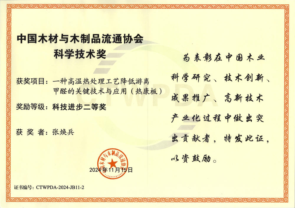 会上,对在推动绿色家居产业链发展中做出杰出贡献的个人和企业进行了荣誉表彰。其中,热康板项目和核心研发人员张焕兵、叶昌海,凭借其卓越的创新技术和科技成果,分别荣获科技进步二等奖。这一荣誉不仅是对热康板技术实力的认可,更是对其在推动绿色家居产业链发展中所做出的积极贡献的肯定。