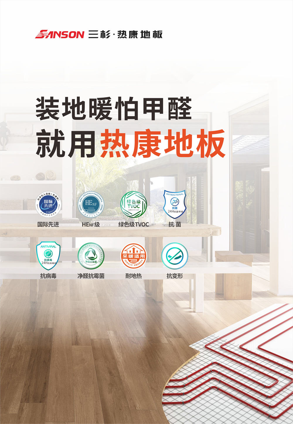 热康板产品包括热康地板,具有HENF级环保(30℃条件下甲醛释放量≤0.025mg/m³)、绿色TVOC、抗菌抗病毒、净醛抗霉菌、耐地热、防潮抗变形等多重特点。特别是热康地板在30℃条件下也不用担心甲醛释放量超标的高环保特性,使得它更适合有地暖的家庭选择。这些特点使得热康地板在市场上具有极高的竞争力,不仅满足了消费者对高品质、环保家居的需求,也为地板行业树立了新的标杆。